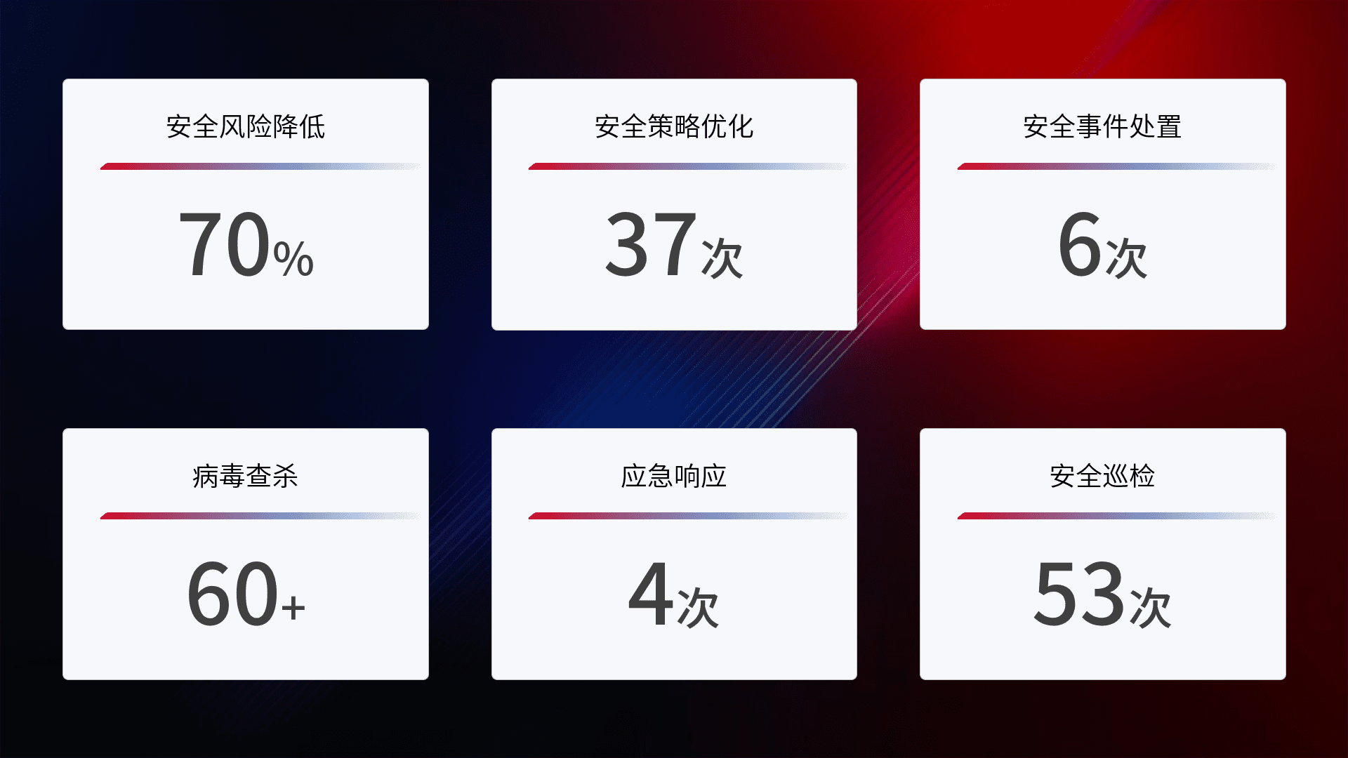 提供全面的安全事件报告体系,,包括处置报告、、、、周报、、、、季度和年度总结,,结合持续监控,,,,帮助客户深入了解网络安全状况。。。。