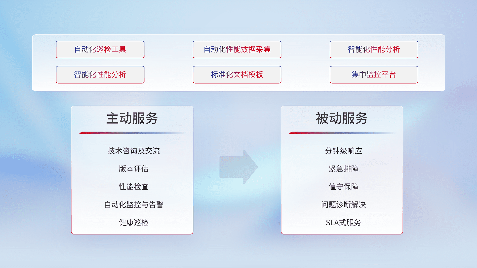 智能化工具和标准化文档,,保障服务质量,,,提供主动服务(包含技术咨询、、版本评估、、性能检查、、自动化监控与告警、、、、健康巡检)和被动服务包含(分钟级响应、、紧急排障、、值守保障、、、、问题诊断解决、、、、SLA服务)。。